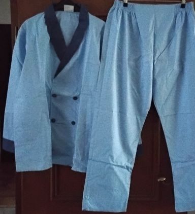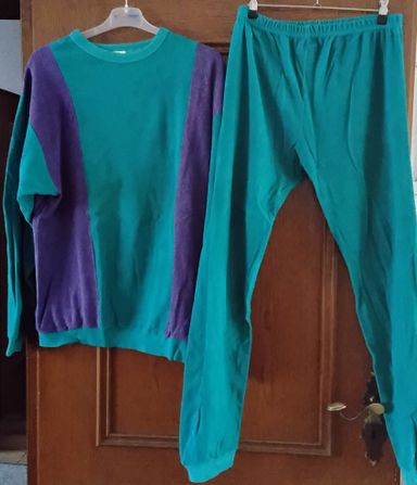 Türkiser-lila Schlafanzug gr: 52 A-A: 62cm, Rücken: 67cm Bund:39cm, länge: 100cm 80% Baumwolle-- 20%Polyamid Preis:4€